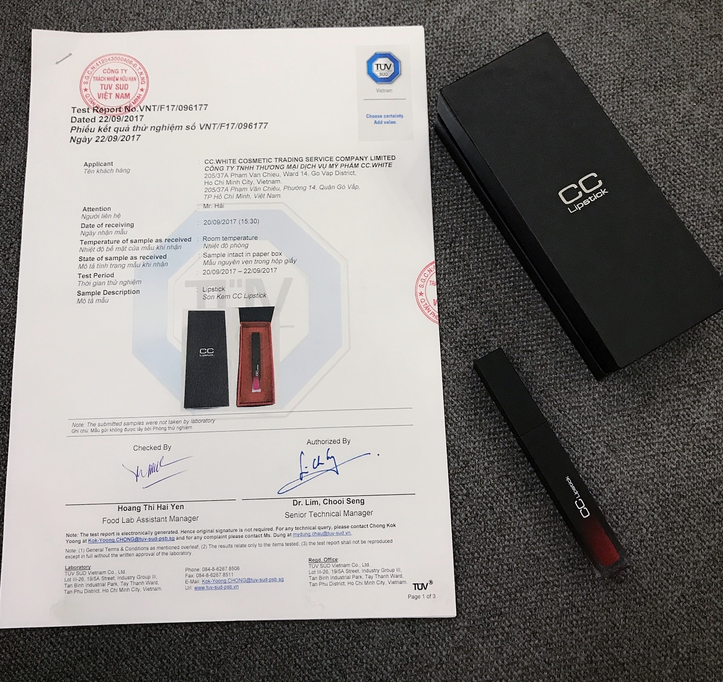 Giấy kiểm nghiệm CC Lipstick đạt tiêu chuẩn quốc tế là cam kết về chất lượng của công ty đối với khách hàng